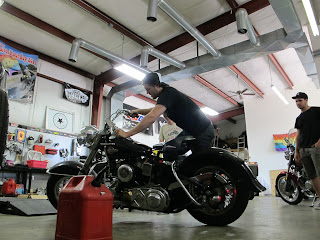 Saturday a lot of folks made it over to Helen, GA for the "Ride to the River to Wreck Your Liver" with the BDAC crew. I was one of those who is too broke to pay attention right now. Us poor folks hung out at the shop and had a little fun. We spent the day helping Stewie with shop projects and by helping I mean busting his balls, getting in his way you know, all the usual stuff. One of the things he was trying to do was to get this flathead running. It started a time or two, but we couldn't get it to stay running. I mostly took pictures of Spenser fighting the bike and offering useless advise like I always do.